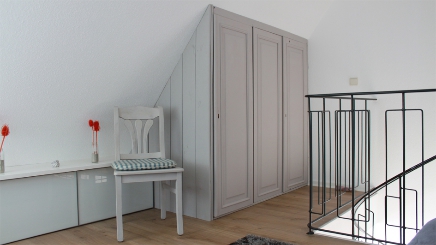 In der unteren Etage befinden sich Bad, Diele , Küche und ein großzügiger Wohn-und Essbereich. Der Wohnraum bietet eine zusätzliche Schlaffunktion. In der oberen Etage liegt das geräumige Schlafstudio, welches bequem über eine Wendeltreppe erreichbar ist.