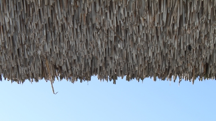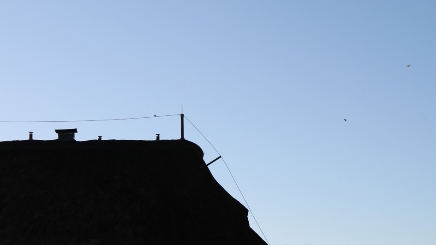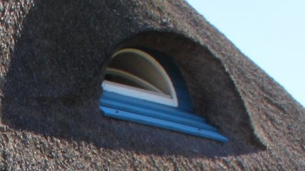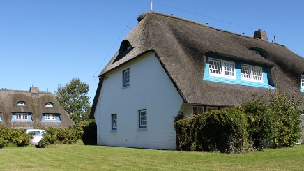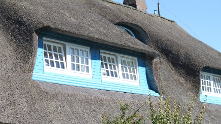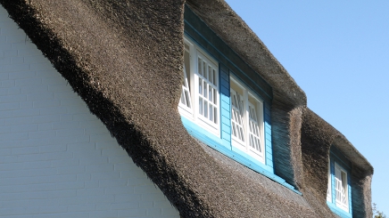 Fassade und weissen Holzsprossenfenstern erbaut. Das Reetdach
